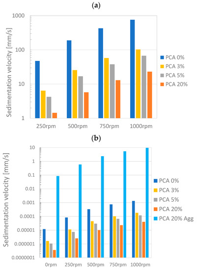 Simulated sedimentation velocity, (a) for SUS304, and (b) for ZrO2 (particles and aggregations).