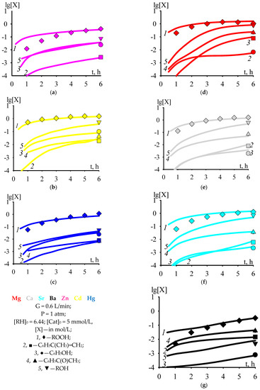 According to the kinetic scheme of cumene oxidation and cumene hydroperoxide decomposition in the presence of Zn, Cd, or Hg 2-ethylhexanoate [32], the formation of acetophenone runs without the participation of a catalyst, according to Reactions (20) and (43). The formation of acetophenone without the participation of a cumene oxidation catalyst was shown experimentally in [38]. However, when cumene oxidation runs in the presence of Mg, Ca, Sr, or Ba 2-ethylhexanoate, the acetophenone is formed by several orders of magnitude more (Figure 1b,c lg[C6H5C(O)CH3] ≤ −2 at t = 6 h) than in cumene oxidation in the presence of Zn, Cd, or Hg 2-ethylhexanoate (Figure 1d–g lg[C6H5C(O)CH3] > −2 at t = 6 h). To take this factor into account, we assumed that ROH·Cat adduct is capable of decomposing into acetophenone, thereby increasing the rate of accumulation of acetophenone, and introduced Reaction (45) into the general kinetic scheme of cumene oxidation and cumene hydroperoxide decomposition in the presence of Mg, Ca, Sr, Ba, Zn, Cd, or Hg 2-ethylhexanoate. In addition, the general kinetic scheme of cumene oxidation and cumene hydroperoxide decomposition in the presence of Mg, Ca, Sr, Ba, Zn, Cd, or Hg 2-ethylhexanoate was supplemented with Reaction (46) [39] and the reaction of catalyst deactivation with phenol (47). A reaction similar to Reaction (47) can run during the synthesis of [CaLi6(μ3-OPh)8(thf)6] from CaI2 and LiOPh, described in [40].