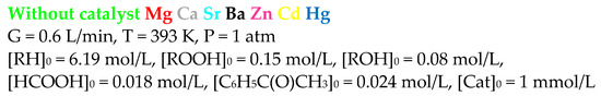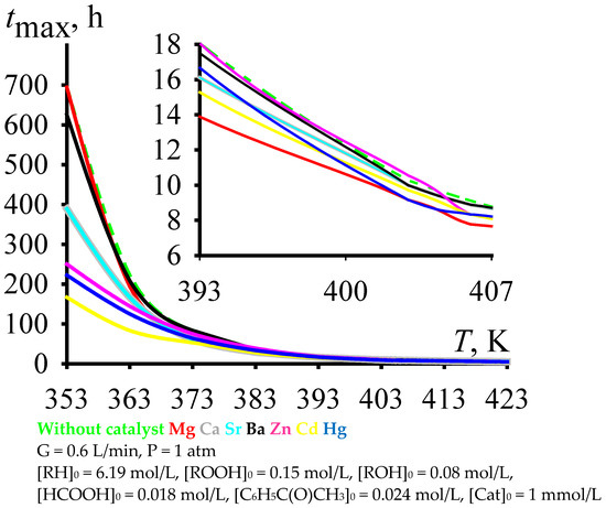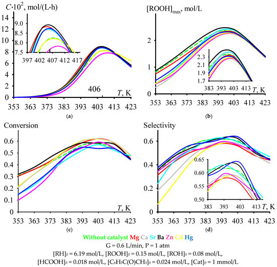 With an increase in the temperature of cumene oxidation, the C criterion increases to a maximum value, after which it decreases (Figure 4a). Under the process conditions shown in Figure 4, the maximum is observed at a temperature range near the value of 406 K, that is, in the range of moderately high temperatures (393–413 K). The dependencies of [ROOH]max (Figure 4b), cumene conversion at tmax (Figure 4c), and selectivity at tmax (Figure 4d) versus cumene oxidation temperature also have maximums in the same range. Moreover, it is rather problematic to unambiguously assess the effect of the catalyst on the ordinate of the maximum in the selected range of moderately high temperatures (Figure 4). Nevertheless, it can be noted that, in this temperature range, some of the catalysts provide selectivity at tmax, which is comparable to the value of the non-catalytic process, and some of the catalysts provide a lower selectivity at tmax compared to the value for the non-catalytic process. The selectivity values relate to each other as follows: Without catalyst ≈ Cd ≈ Ba ≈ Hg > Mg ≈ Ca ≈ Sr ≈ Zn (Figure 4d).