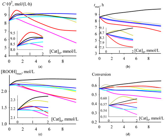 The dependencies of criterion C (a), tmax (b), [ROOH]max (c), cumene conversion at tmax (d), and selectivity at tmax (e) versus initial catalyst concentration.