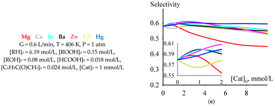 Among the dependencies of criterion C versus the initial concentrations of the catalysts under consideration at a temperature of 406 K, selected from the range of moderately high temperatures of 393–413 K, there is a dependence for cumene oxidation in the presence of Mg 2-ethylhexanoate. At initial catalyst concentrations less than 2 mmol/L, the values of criterion C are higher than for the process run in the presence of any of the other considered catalysts. Moreover, the maximum value of C is observed at an initial concentration of Mg 2-ethylhexanoate of 1 mmol/L (Figure 5a). At this initial concentration, the criterion C has a maximum or close to maximum value (with an increase in the initial catalyst concentration, the value of C after its maximum or close to maximum value decreases or, after a slight increase, it reaches a slightly decreasing plateau) and depends on the catalyst: Mg > Ba > Hg ≈ Ca ≈ Sr > Cd ≈ Zn. The time of reaching the maximum value of criterion C at an initial catalyst concentration of 1 mmol/L lines up in the series Ba ≈ Ca ≈ Sr > Hg ≈ Cd ≈ Zn > Mg (Figure 5b). The maximum concentration of cumene hydroperoxide (Figure 5c), cumene conversion (Figure 5d), and selectivity (Figure 5e) at an initial catalyst concentration of 1 mmol/L hardly depend on the catalyst and lie in the ranges of 2.2–2.3 mol/L (the value of 2.2 mol/L is typical for a non-catalytic process), 0.55–0.61, and 0.56–0.60, respectively.