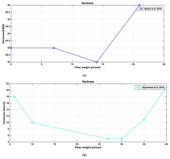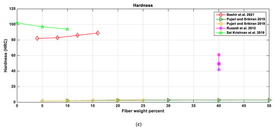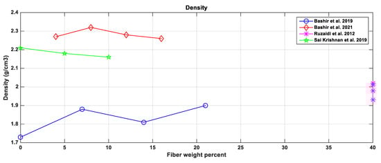 In order to provide better comparative observations of the effect of these natural fiber types and their contents on the resulting properties, the results obtained by other researchers are plotted, as shown in Figure 3, Figure 4, Figure 5, Figure 6 and Figure 7. For example, palm kernel fibers [62] show values of wear rate and hardness, as the fiber content is constant while the pressure used during manufacture varies from 10 to 60 tons. In addition, the inverse relationship between the density and the porosity is quite clear when examining Figure 3 and Figure 4. Moreover, the density increased for banana fiber weight percentages (Wt.%) of 63% and 82% parent matrices, until reaching a certain fiber weight percentage before decreasing. However, the density of the 63 Wt.% composite increased again after the decrease happened at the 14% Wt.% fiber content. Palm kernel with a 54% Wt.% fiber content recorded a density drop when the fiber weight percentage increased. This drop could be due to the change in fillers and the friction modifier MoS4 used (Figure 3).