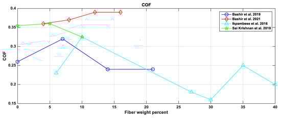 The tribological properties recorded an obvious improvement as the fiber weight percentage increased. Most formulations recorded a trend for enhancement of the properties. The banana fibers recorded a trend of increasing the COF among all of the formulations, except that of the 63% parent matrix (Figure 6). The COF in Figure 6 is the average value for banana fibers [43,44] as it was examined at different temperatures and different loads.