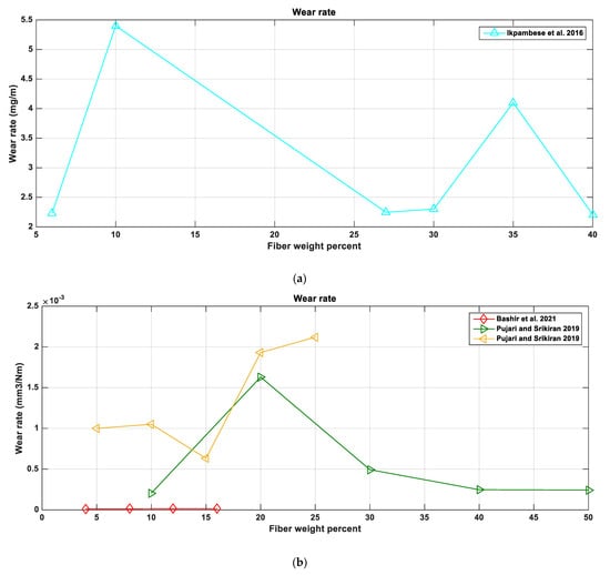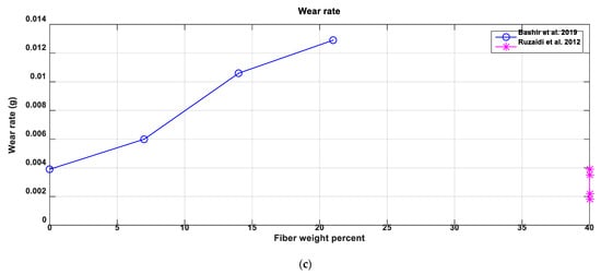 Figure 7. (a) The variation of wear rate for different fibers for different fiber weight percentages in mg/m [56], (b) the variation of wear rate for different fibers for different fiber weight percentage in mm3/Nm [44,57], (c) and the variation of wear rate for different fibers for different fiber weight percentage in g [43,62].