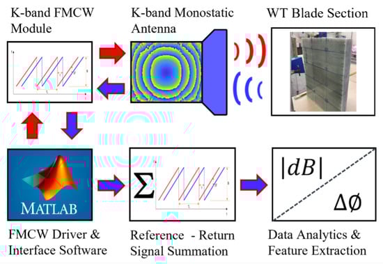 In this paper, we present a unique method of NDE for surface and sub-surface diagnostics of composite material in WTB samples by utilizing a patented Frequency Modulated Continuous Wave (FMCW) radar technology. This compact sensing technology is electromagnetic, non-contact, light weight, low power, robust and tunable, providing viable payload for autonomous, as well as resident, inspection systems [48]. Previous work of FMCW sensing for material analysis as an inspection tool for the K-band and X-band has been reviewed and summarized by the authors [49]. FMCW has recently been applied as a system for NDE of WTBs for studying the delamination, cracks, water ingress and composite material characterisation [50,51]. Other applications include analysis of dynamic load deformation in geomaterials for sample failure prediction [52], detecting corrosion and corrosion precursors [53] and for the analysis of core contents of partially fluid-saturated materials [54,55]. The technology was also shown to support localization in opaque environments and for safety applications, wherein the detection of people concealed by walls can provide forewarning of people about to enter the mission space of an autonomous robotic platform [56,57,58,59].