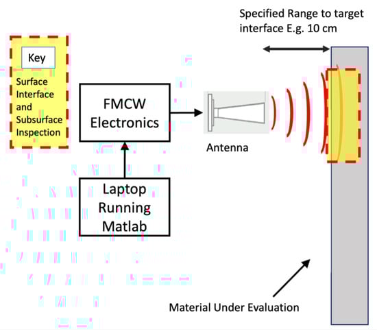 The FMCW radar sensor was configured in the following way as highlighted in Figure 2. This method allowed for surface and subsurface analysis of the material under test where MATLAB was utilised to initiate the continuous wave and collect data at the transceiver antenna.