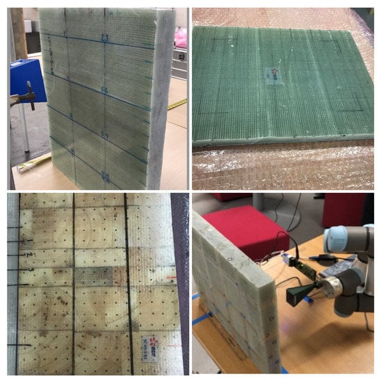(top left) Composite material test sample No.1 with monolithic thickness of 48.7 mm, (top right) No.2 with monolithic thickness of 51.2 mm, (bottom left) No.3 with sandwich composites with thickness of 27.8 mm, (bottom right) Raster scanning on test samples using UR3 robot manipulator arm.