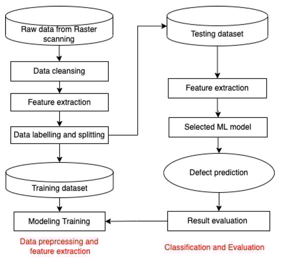 In machine learning, classification refers to the ability of a model to assign instances to their correct groups. In the context of our case, this means to correctly output the type of composite sample when given radar RSA from a specific area of scanning. The process of machine learning classification modeling for the analysis of composite materials utilizing FMCW radar RSA data involves several steps(as illustrated in Figure 4). Firstly, the raw data are obtained through the method outlined in Section 4.2. The raw data are then subject to cleaning and normalization procedures, and are labeled accordingly. The dataset is then divided into two subsets, with the majority being allocated to the training dataset (75% of the total dataset) and the remaining portion allocated to the testing dataset (25% of the total dataset). This approach allows for the development of an accurate model through the training dataset, and the evaluation of its performance through the testing dataset.