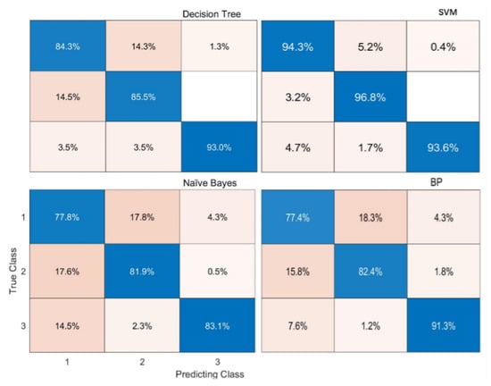 The results of Table 3 are also presented in a confusion matrix, also known as an confusion matrix to give a improved visualization of the performance of different algorithms. In the matrix, each cell shows the percentage of testing data from a given true class that is classified as a particular predicting class by the model. As shown in the confusion matrix in Figure 5, for all models, when given test data from Class 1 (or Class 2), incorrect outcomes are more frequently classified as Class 2 (Class 1) than Class 3. Overall, our machine learning model is still able to distinguish Class 1 and 2: the SVM model achieves very promising results with accuracy of 94.3% and 96.8%. Moreover, all of the models exhibit better performance when classifying samples with different material structure (given Class 3). This demonstrates the sensitivity of the FMCW, and the capability of these machine learning models to extract key features from the radar RSA. The results demonstrate the ability to detect minor inner characterisation differences of testing samples, this is an advantage that cannot be achieved with the current state of the art externally deployed NDE technologies for composite turbine blades.