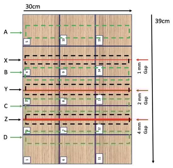 We conduct raster scans using the same equipment setup described in Section 3.1, using samples No.5 and No.6 to collect data pertaining to the air gap defect. Specifically, sample No.5 contains air gaps of 1 mm, 2 mm, and 4 mm for the first SC sample, and sample No.6 contains 6mm air gap. Figure 7 gives an illustration of the SC sample No.5 inner structure, our FMCW scanning took place where air gaps are present, i.e., areas labelled as A, B, C and D for healthy areas, as well as sections X, Y, and Z for areas containing the air voids defect. For the SC sample 6, we repeat our scanning process but instead scanned two areas/sections: healthy area, and areas with 6mm air gap.