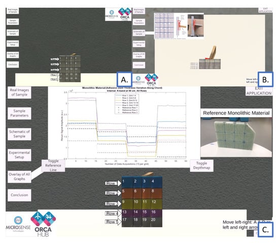 The Asset Integrity Dashboard(AID) was developed as an investigation into visualisation techniques for FMCW return signal data This work can be viewed online at https://smartsystems.hw.ac.uk/asset-integrity-dashboard-version-2/ (accessed on 29 January 2023). It was developed in Unity3D for Windows and HTML5 web integration. The data returned from the FMCW experiment is not immediately intuitive and requires analysis to understand. For operators with a lower working knowledge of FMCW technologies but have an understanding of subsurface defects and asset integrity, a more visual and intuitive method of displaying this data can be beneficial. The AID acts as a DT of a WTB section, with buttons on the left hand side allowing an operator to view different pieces of information about the asset, along with a 3D model of the WT blade section which changes appearance depending on what information is being displayed. An overview of the interface can be seen in Figure 8A.