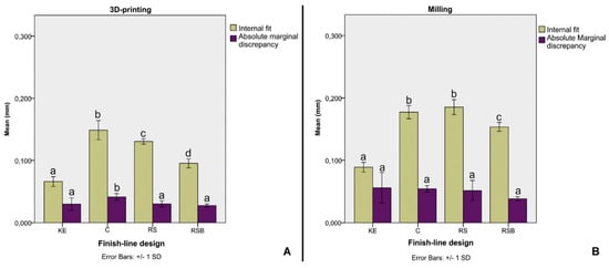 - Alharbi, N.; Alharbi, S.; Cuijpers, V.M.; Osman, R.B.; Wismeijer, D. Three-dimensional evaluation of marginal and internal fit of 3D-printed interim restorations fabricated on different finish line designs. J. Prosthodont. Res. 2018, 62, 218–226. [Google Scholar] [CrossRef]