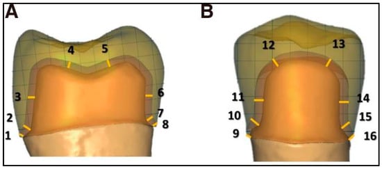 - Oğuz, E.İ.; Kılıçarslan, M.A.; Ocak, M.; Bilecenoğlu, B.; Ekici, Z. Marginal and internal fit of feldspathic ceramic CAD/CAM crowns fabricated via different extraoral digitization methods: A micro-computed tomography analysis. Odontology 2021, 109, 440–447. [Google Scholar] [CrossRef] [PubMed]