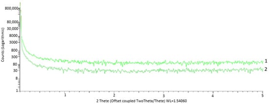 Absence of narrow (angular width 2θ < 2°) diffraction peaks from the crystalline phase is indicative of a disordered—close to amorphous—state of the frame fibers. This is quite understandable, since the structure of the initial PCS fibers is completely amorphous (Figure 2 and Figure 3) and the maximum temperature for obtaining the organomorphic SiC framework (1250 °C) does not reach even half of the incongruent decomposition temperature of silicon carbide []. However, the first—less wide—maximum corresponds to the strongest line (111) of β-SiC (reference code 98-002-8389), since this modification is formed during annealing of silicon carbide in a nitrogen atmosphere []. The second wide peak is apparently a superposition of other two strong lines, namely, (022) and (113).