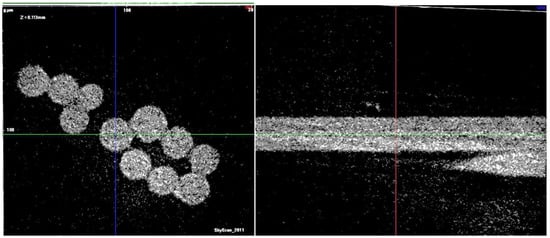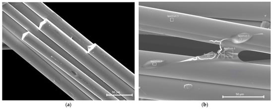 These buildups are not present on all fibers and are characterized by irregular concentrations. It is probably for that reason that, after TMA, the PCS sample shows less irreversible compression in the indenter pressure area than the PAN sample, the entire surface of which is covered with resin-forming compounds that effectively bind the filaments [] (Figure 9 and Figure 10).