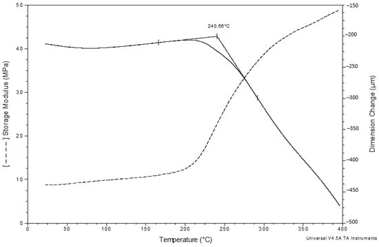 What draws attention is the timely coincidence of the sharp decrease in the sample thickness and the rapid increase in the elasticity modulus—both processes start at 215–220 °C. The decrease in thickness can be explained both by the partial tangential displacement of the fibers towards the pot walls with rising temperature due to friction reducing between the fibers and the increase in the degree of their contact simultaneously with the deformation of the fibers themselves at a temperature preceding the pyrolysis onset temperature. On the DTG curve, the onset of gas emission from PCS fibers practically corresponds to the start of the events during TMA (Figure 5).