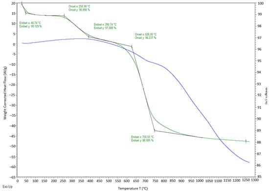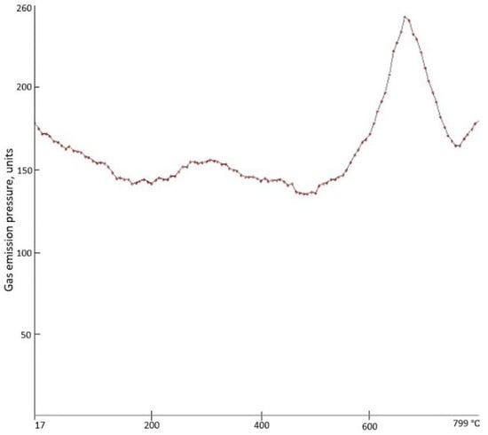 The second (higher) peak of gas emission starts at 500 °C, reaches its maximum at 660 °C, and ends at 740 °C. In this case, the MID-1 pressure sensor does show it, meaning that it is associated mainly with release of hydrogen, since it is not frozen at the liquid nitrogen temperature. The mass spectrometry results also correlate with the DTA data of differential thermal analysis (Figure 5). However, according to [], a significant mass loss (more than 7% wt.) is provided by the evolution of both hydrogen and methane.