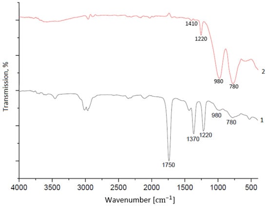 Results of IR-spectroscopy of the PCS fibers before (1) and after (2) TMA.