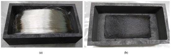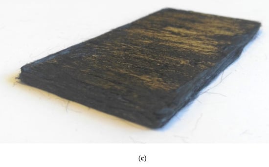 OP-SiC: (a) unidirectional PCS tape in a container before pyrolysis; (b) SiC frame, 90 × 45 × 4 mm in size, reinforcement scheme 0°/0° []; and (c) SiC frame, 90 × 45 × 3.5 mm in size, reinforcement scheme 0°/90°.