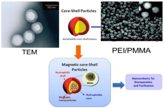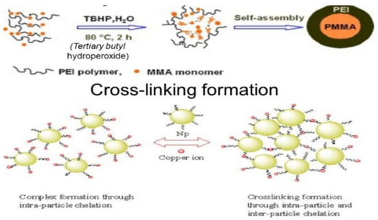 Spherical, well-defined core-shell PEI/PMMA (polyethyleimine/polymethyl methacrylate) nanoparticles represent a specific molecular type of particles that can be developed for wastewater treatment. In a preliminary work, nanoparticles were developed from PEI and PMMA, as well as PMMA and chitosan through graft copolymerization [89] (Figure 2). This method is not directly employed to immobilize monomers with amine chelating groups. Instead, a two-stage modification was conducted by involving the grafting of an epoxide-containing glycidyl methacrylate followed by the immobilization of PEI (Figure 3). The PEI not only improved the dispersion of the nanoparticles, but also brought new properties to the nanocomposite. Grafted PMMA provided support for the PEI chains in the adsorbent [98]. Further variations in the structure and functionality of the polymers can be achieved by altering the properties and synthesis techniques for the precursor chains.
