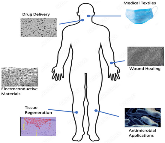 The term “medical textiles” describes quality-assured products made of fibers obtained from natural or synthetic polymers and used for medical purposes, including but not limited to surgeries, enhanced hygiene, and clinical treatments [73]. Blow-spun polymer fibers can be further functionalized by incorporating additives such as nanoparticles [74], hydrogels [75], and bioactive compounds [76] to enhance their inherent properties. Medical textiles are widely used in the healthcare and well-being sectors. Current applications of medical textiles encompass wound care [77], biomedical [78], as well as conductive and electronic applications, combining textile science and electronics [79]. Medical textiles are primarily woven, knitted, or braided fabrics and have the advantages over non-woven forms in wound healing and tissue regeneration [77,78].