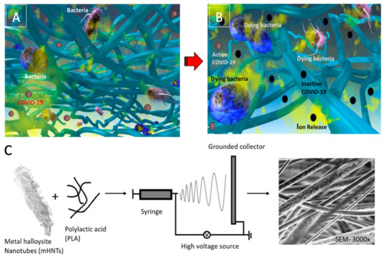 (A,B) Graphic depicting metal-coated HNTs (mHNTs) embedded in blow-spun fibers used to inhibit bacterial growth and inactivate viruses. (C) The mHNTs and PLA electrospun fibers were used as part of a filter system to be used in N95 mask [67].