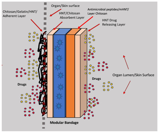 Furthermore, it was demonstrated that solution blow spinning could be used only to control the delivery of progesterone but also to encapsulate an active agent into polymer fiber. Recently, to control delivering amphotericin B, Gonçalves, et al. [72] fabricated core-shell nanofibers based on poly (L-lactic acid) and poly (ethylene glycol) with a solution blow spinning method. As a result, they could design outstanding polymeric nanocarriers with smooth surfaces and uniform morphology. Consequently, the solution blow spinning method could be an important and valuable choice for fabricating different drug delivery systems to treat various diseases. Figure 5 illustrates a concept for a multifunctional bandage that could be used for cutaneous or mucosal drug delivery, injuries, or as an anastomoseal after abdominal organ surgery.