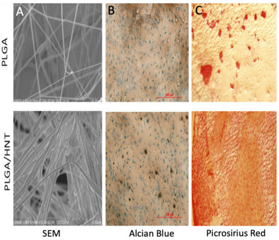 PLGA (poly(lactic-co-glycolic acid) is an FDA-approved copolymer which has been widely investigated in developing bone implants and scaffolds due to its biocompatibility and biodegradability. Boyer et al. (2015) demonstrated that halloysite nanotubes (HNTs), a recognized nanocontainer and nanocarrier, could be embedded in blow-spun fibers as three-dimensional scaffolds for bone tissue generation (Figure 6) [101]. Pre-osteoblasts proliferate and produce a matrix rich in glycosaminoglycans and collagen.