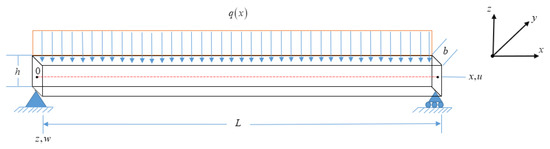 For the examples and numerical calculations, a simply supported piezoelectric beam is considered, as shown in Figure 2, with length , thickness and height . The value of the height depends on the aspect ratio values. Zero electric potential at the upper and lower surface of the beam is considered (short circuit electric conditions) and for this reason, a TYPE II expression of the function is chosen. In the static problem, the beam is subjected to a uniformly distributed exterior load ( for the results presented below). The piezoelectric material of the beam is PZT–4 [28], with density and an elastic coefficient matrix as follows: