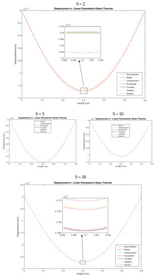 From the above numerical results, it is concluded that the general model underestimates the maximum transverse displacement for very thick beams (), while it overestimates for thick (, ) and slender () beams. The maximum electric potential predicted by the general model is in very good agreement with the exact solution for slender beams ().