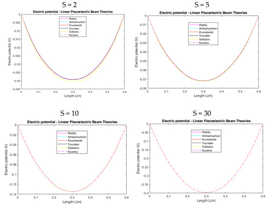 Comparison of electric potential through the length of the beam at for various aspect ratios and for all models with higher order shear deformation terms.