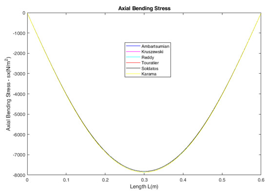 Comparison of axial stress through the length of the beam at for all models with aspect ratio .