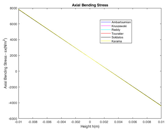 From the numerical results presented in Table 4, it follows that the axial bending stress predicted by all models is in very good agreement with the exact solution for beams with aspect ratio . The maximum transverse shear stress predicted by the Touratier model is in very good agreement with that from the exact solution. The models of Ambartsumian, Reddy and Soldatos underestimate while the model of Karama overestimates the value of transverse shear stress for beams with aspect ratio .