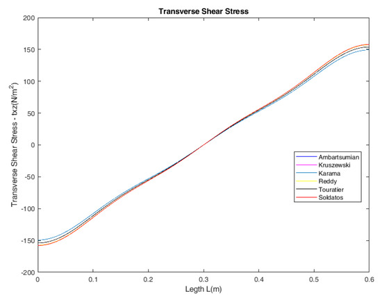 Comparison of transverse shear stress through the length of the beam at for all models with aspect ratio .