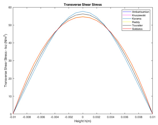 Comparison of transverse shear stress through the height of the beam at for all models with aspect ratio .