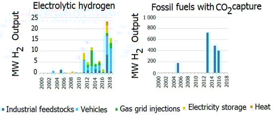 In the past few years, there has been a rise in the number of programs to make hydrogen meet energy and climate goals. Since 2000 [7], 230 projects have been launched worldwide to convert electrical energy to hydrogen (Figure 1). The capital costs of water electrolyzers installed in 2017 and 2018 are about USD 20–30 million annually. Additional investments in storage tanks, refueling infrastructure, pipes, and other equipment will make the total cost of a project even higher. Both alkaline and proton exchange membrane (PEM) electrolyzers are routinely used in these programs, but recent projects have tended to favor PEM, reflecting that many test conditions favor less mature technologies with considerable cost-saving potential.