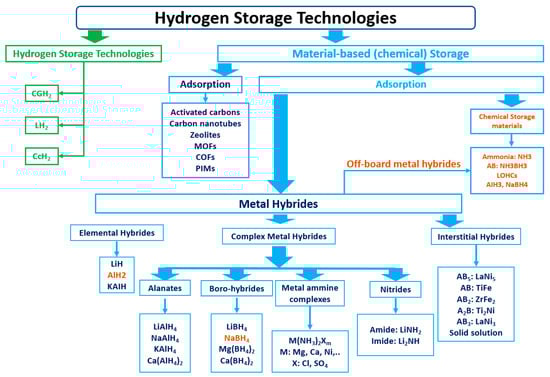 Current options for onboard hydrogen storage include compressed hydrogen gas, cryogenic and liquid hydrogen, sorbents, metal hydrides, and chemical hydrides (Figure 2) [37].