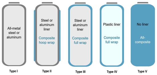 The most established hydrogen storage technology is compressed gas storage in high-pressure tanks. There are four conventional forms of hydrogen storage vessels: Type I, Type II, Type III, and Type IV (see Figure 3) [38]. Type I vessels are all-metal (generally steel) and thus the heaviest; they are primarily used in industry for fixed use. At 200–300 bar, Type I vessels store around 1% of hydrogen globally [39]. Type II vessels have a composite sleeve (hoop direction) over a metal liner that weighs less than Type I. Both Type I and II vessels are unsuitable for vehicle applications due to their low hydrogen storage density, caused by high mass and hydrogen embrittlement issues. A fully wrapped composite cylinder with a metal liner that functions as a hydrogen permeation barrier is used in Type III vessels. The metal liner is generally aluminum (Al), eliminating embrittlement and providing more than 5% mechanical resistance [40]. Type III vessels have a mass increase of 25–75% over Types I and II vessels, making them more suited for vehicle applications; nevertheless, they are more expensive. Type III vessels have also been proven reliable at pressures up to 450 bar; however, pressure cycling tests over 700 bar continue to provide issues [41]. A fully wrapped composite cylinder with a plastic liner (usually high-density polyethylene) that serves solely as a hydrogen permeation barrier is used in Type IV vessels. The load-bearing structure is the composite overwrap, commonly comprised of carbon fiber or carbon/glass fiber composite in an epoxy matrix. Type IV pressure vessels are the lightest of the pressure vessels, making them ideal for vehicle applications, and they can withstand pressures of up to 1000 bar [42]. However, they are prohibitively expensive because of the high cost of carbon fibers. Considering the high production volumes, cost estimations suggest that carbon fiber accounts for approximately 75% of the storage vessel cost. Type V tanks are at the design stage and are likely to use a thermoplastic liner and composite structure that are more closely linked; the composite and the liner will be made from the same thermoplastic polymer [43], but further development is required to ensure these tanks are safe in service.