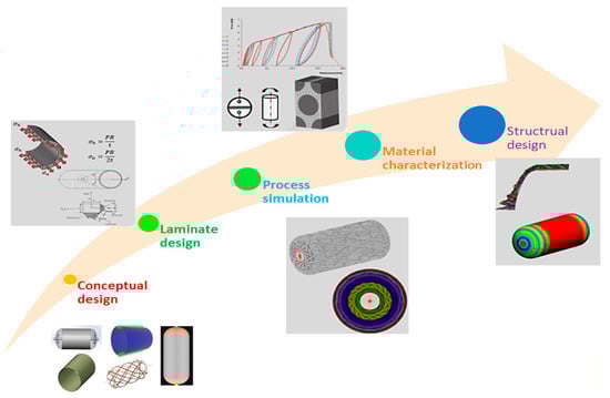 Some problems with making hydrogen tanks for commercially available fuel cell vehicles include reducing the filament winding cycle time and making sure they are safe, light, cheap, etc. The US Department of Energy’s (DOE) Office of Fuel Cell Technologies saw these problems and started a project to design and build hydrogen tanks. The project looked into different options for the matrix resin, carbon fiber, and the shape of the tank design [64]. However, for the resin option, they did not think about thermoplastic resin, which is good for the environment and shortens the time it takes to make something. The designer must take into account the general characteristics, such as tank capacity, working pressure, material attributes, and safety factors. A complete design cycle of a composite hydrogen tank is illustrated in Figure 8.