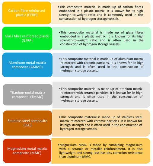 Composite materials are also highly cost-effective for hydrogen storage vessels. They are lightweight, which reduces the overall cost of the vessel, and they are also easy to fabricate, reducing manufacturing costs. Additionally, composite materials have a long service life and require minimal maintenance, which further reduces the overall cost of the vessel [68]. Some common materials used in the design of composite hydrogen storage vessels are presented in Figure 9.