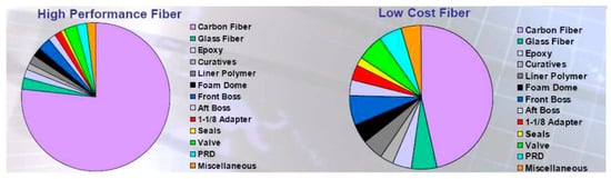 This technology requires research and development to reduce costs while improving the performance, dependability, and durability of existing high-pressure vessels. Due to internal pressure, the composite shell can sustain significant mechanical loads. The extensive usage of carbon fiber accounts for 50–70% of the vessel’s final cost (Figure 10). A composite structural optimization will allow for significant cost reductions in hydrogen devices. Numerical simulation needs to be improved because most engineers today work with simplified models that are frequently far from the real situation [69].