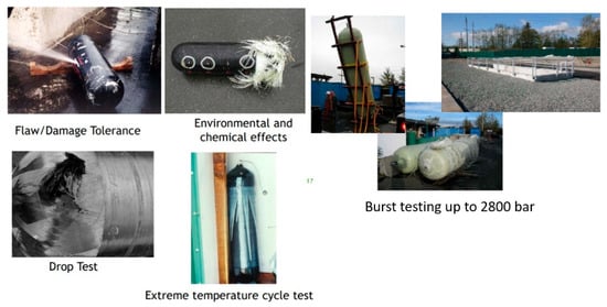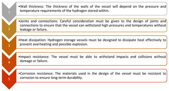 Several key considerations must be considered when designing a composite hydrogen storage vessel. Two of the most important considerations are the pressure and temperature requirements of the vessel. Hydrogen storage composite vessels must withstand extremely high pressures, typically 350 to 700 bar, and low temperatures of 20 K without failure or deformation. Another critical consideration is the composite materials’ strength-to-weight ratio [71]. Hydrogen storage vessels must be lightweight and highly durable, and composite materials are an excellent option as they have a high strength-to-weight ratio. Additionally, the reinforcement fibers used in the composite materials must be chosen carefully to ensure they can withstand the high pressures and temperatures required. The vessel’s design must also consider the safety and security of the hydrogen storage. The vessel must be designed to prevent leaks or spills and withstand impact and thermal cycling, which is particularly important for safely transporting hydrogen. Designing a composite hydrogen storage vessel requires careful consideration of the materials and structural design to ensure safety and durability. Some key factors are presented in Figure 11.