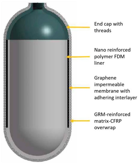 Other projects have aimed to develop high-performance and lightweight Graphene-CFRP compressed hydrogen storage tanks that are becoming increasingly popular for aerospace applications [73]. These tanks are designed to store and transport hydrogen safely and efficiently while also being lightweight and durable enough for aerospace applications. One key component of these tanks is the nanomaterial-reinforced 3D printed polymer liner, which provides a barrier to hydrogen permeation and prevents hydrogen from escaping. Another critical component is the graphene low permeability layer, which provides additional protection against hydrogen permeation. Finally, the graphene and related materials-reinforced matrix CFRP composite overwrapped layer provides a strong, durable, and lightweight outer layer that can withstand the harsh conditions of aerospace applications (see Figure 13). These advanced materials and design elements make Graphene-CFRP compressed hydrogen storage tanks ideal for use in aerospace applications and help promote clean energy sources.