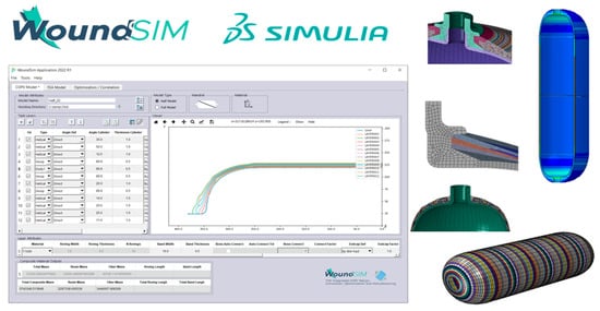 The finite element analysis has evolved into a potent tool for solving numerical issues associated with complicated structures. Using a combination of continuum damage mechanics (CDM) and FEA, the progressive failure analysis of the composite vessel accounts for the stiffness degradation and predicts the rupture pressure [76]. In particular, the FE approach that implements the damage model has attracted considerable scholarly interest. Several intelligent algorithms that imitate the evolutionary concepts of computational biology, physics, and immunology have been utilized to optimize composite vessels. Genetic algorithms, simulated annealing, and artificial immune system are standard algorithms. Multiple commercial algorithms exist today for generating filament winding pathways, and they all rely heavily on the shape of the mandrel. In order to enhance the final product’s performance, researchers have investigated a more complicated path-generating approach, as detailed in the work presented in [77]. The approach considered the mandrel’s evolving shape due to the ply’s unequal thickness distribution from previous winding processes. The alternative strategy involves using high-tech machinery and paying for commercial software for path creation to arrive at an optimal design for the COPV. Using a simulation tool like WoundSim [42] can help reduce the time and cost of developing composite hydrogen storage tanks, allowing designers to test and optimize their designs without needing physical prototypes (Figure 16). This can be particularly useful when working with composite materials, as these materials can be difficult to work with and require specialized manufacturing processes. Advanced features like optimization, parametric design, and creation of experiments are available in WoundSIM. The translation efficiency in FEA is defined as the ratio of the observed failure strain to the theoretical composite tensile strain. The model’s fiber quality, winding method, manufacturing process, and actual structure vary (e.g., voids, fiber misalignment, resin pockets, etc.). Each tank maker has varied translation efficiency, discovered via experience. The FEA model must be calibrated to obtain translation efficiency and account for the abovementioned changes. WoundSim is a set of comprehensive features that ensure a rapid design and simulation of pressure vessels. Overall, using simulation tools like WoundSim is an important part of the hydrogen storage vessels industry, allowing designers to create more efficient and effective products using advanced materials. The main features are listed below: