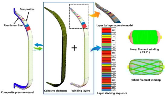 Commonly, FEA is used to investigate the behavior of the directional mechanical properties of carbon fiber composite material, which is particularly important for hydrogen storage pressure vessels (Figure 16). When addressing hydrogen pressure vessels subject to internal loads, many failure modes, including fiber deterioration and matrix damage, are frequently examined [78]. Leh et al. [79] published a well-developed progressive damage model to explore the failure behavior of a Type IV hydrogen storage pressure vessel; the work presented two FE models to mimic situation 28, in which the vessel’s internal pressure builds until the composite vessel fails abruptly. Nguyen et al. [80] completed considerable research on damage modeling of various composites and developed an outstanding instrument for analyzing the damage status of hydrogen storage vessels subjected to thermomechanical loads.
