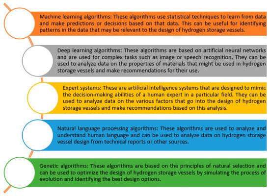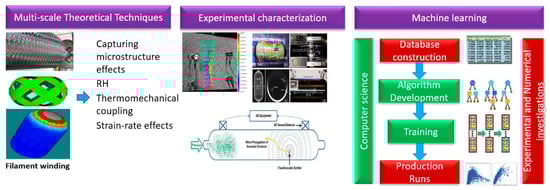 This paper examines using composites and nanocomposites in hydrogen storage tank applications. Different machine learning techniques are applied to characterize and predict the performance of composite materials at different length scales. In practice, these methods use dimensionality reduction techniques to reduce the generated dataset and train a machine learning classifier to predict mechanical behavior at the structural level [35,36]. This paper presents the application of artificial intelligence and digital twin technologies for predicting the hygro-thermomechanical behavior of hydrogen storage vessels. The article is structured as follows: Section 2 provides an overview of current hydrogen storage vessel types. The hydrogen storage vessel design is explored in Section 3. The use of composite materials and nanocomposites for hydrogen storage vessels is presented in Section 4. Section 5 comprehensively reviews the numerical approaches employed in modeling the hygro-thermomechanical behavior of hydrogen storage vessels. The artificial intelligence and optimization models for modeling the composite hydrogen storage tanks are presented in Section 6.