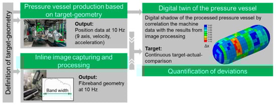 - Hopmann, C.; Magura, N.; Müller, R.; Schneider, D.; Fischer, K. Impact of winding parameters on the fiber bandwidth in the cylindrical area of a hydrogen pressure vessel for generating a digital twin. Polym. Compos. 2022, 43, 1577–1589. [Google Scholar] [CrossRef]