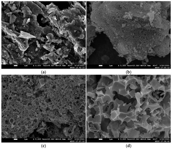Figure 2. SEM micrographs of coconut-shell derived carbons without KOH (a) and at different KOH concentrations (bd). Reproduced from MDPI [89].