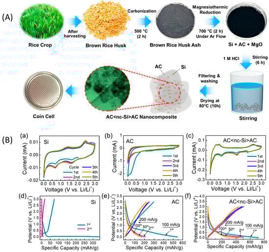 Figure 4. (A) Preparation of activated carbon/silicon nanocrystals composite materials and (B) cyclic voltammetry and galvanostatic charge–discharge (GCD) curves of the materials prepared. Adapted from MDPI [106].