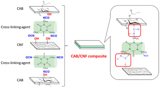 Therefore, in this study, we attempted to fabricate sandwich material from bamboo- derived CNF and CAB directly by hot pressing, which is another molding method. Moreover, polyisocyanurate (D376N) was added to convert the hydroxyl groups remaining in the cellulose thermoplastic, and the hydroxyl groups present on the CNF surface, into urethane bonds. The CAB/CNF/D376N system can form covalent cross-links, which will enhance the interaction between the matrix and the fibers. This improved interaction will in turn prevent the two components from delamination, which will enhance the mechanical properties. The applied polyisocyanurate derives from biomass and has the advantage of not generating by-products when hydroxyl groups and isocyanate groups react to form urethane bonds and is environmentally friendly from the viewpoint of volatile organic compound emissions. Process parameters (hot-press pressure, time) were studied to find optimal conditions. The cross-linking between CNFs and at the CNF/CAB interface was investigated.